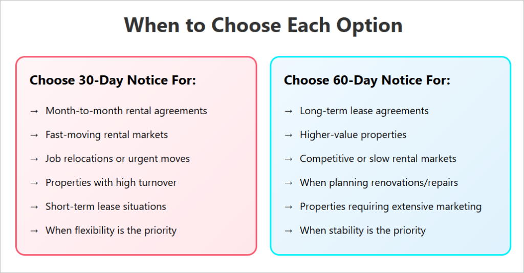 Choosing between a 30-day and a 60-day notice comes down to timing, lease terms, and local rules.