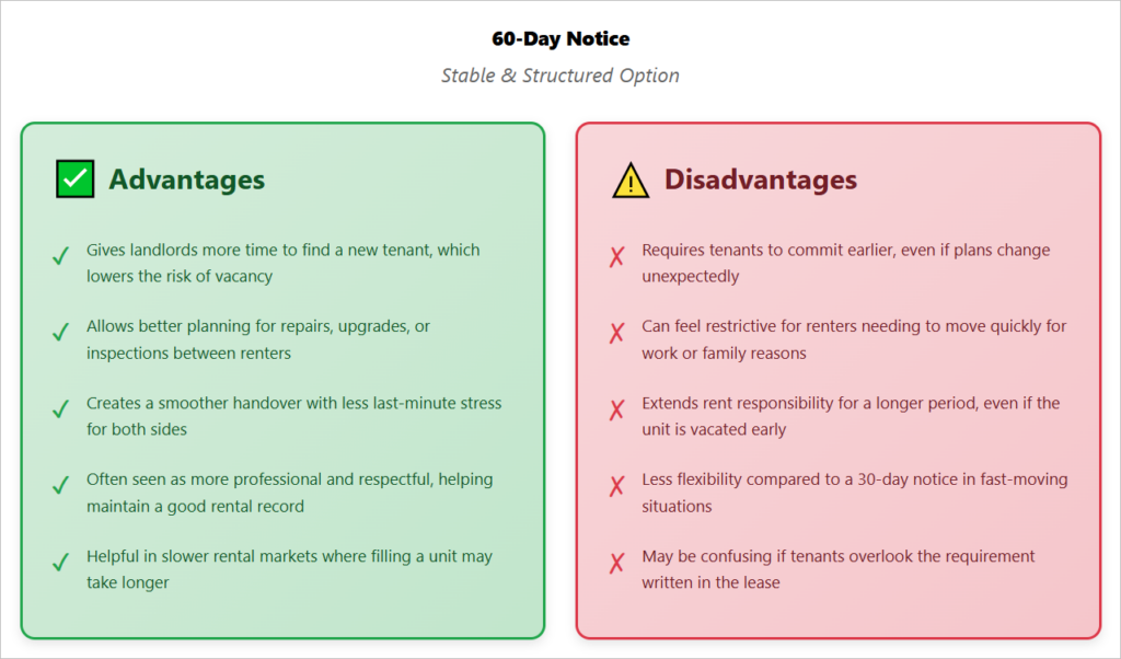 Many landlords prefer a 60-day notice because it helps with planning. Extra time allows them to advertise the unit, schedule showings, and line up maintenance or upgrades without rushing. In competitive or slower rental markets, this longer window reduces the risk of vacancy and lost income. It also supports smoother transitions, which benefits property managers handling multiple units.